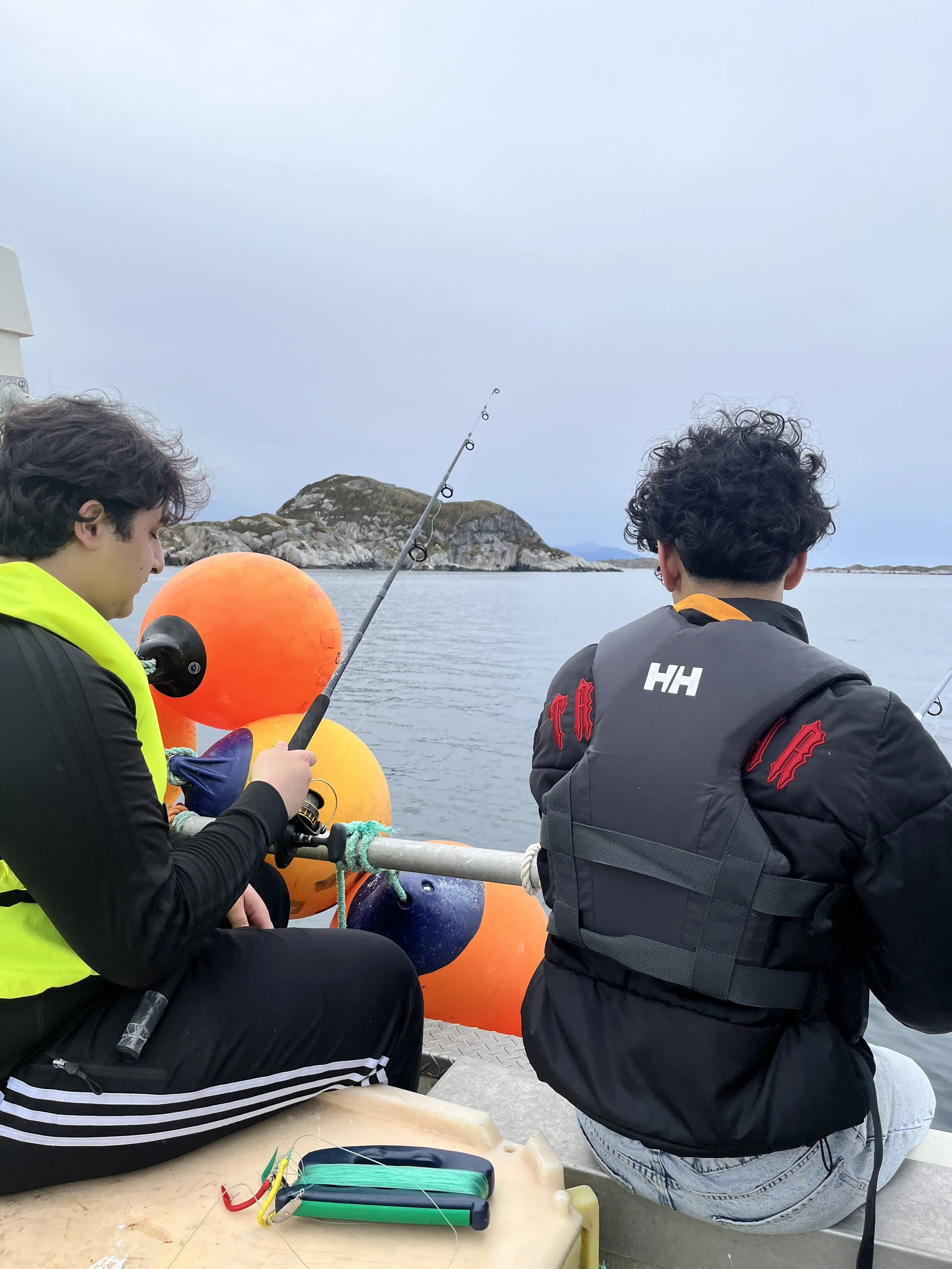 To personer fisker fra en båt med bøyer i vannet, mot en øy i Bakgrunnen.